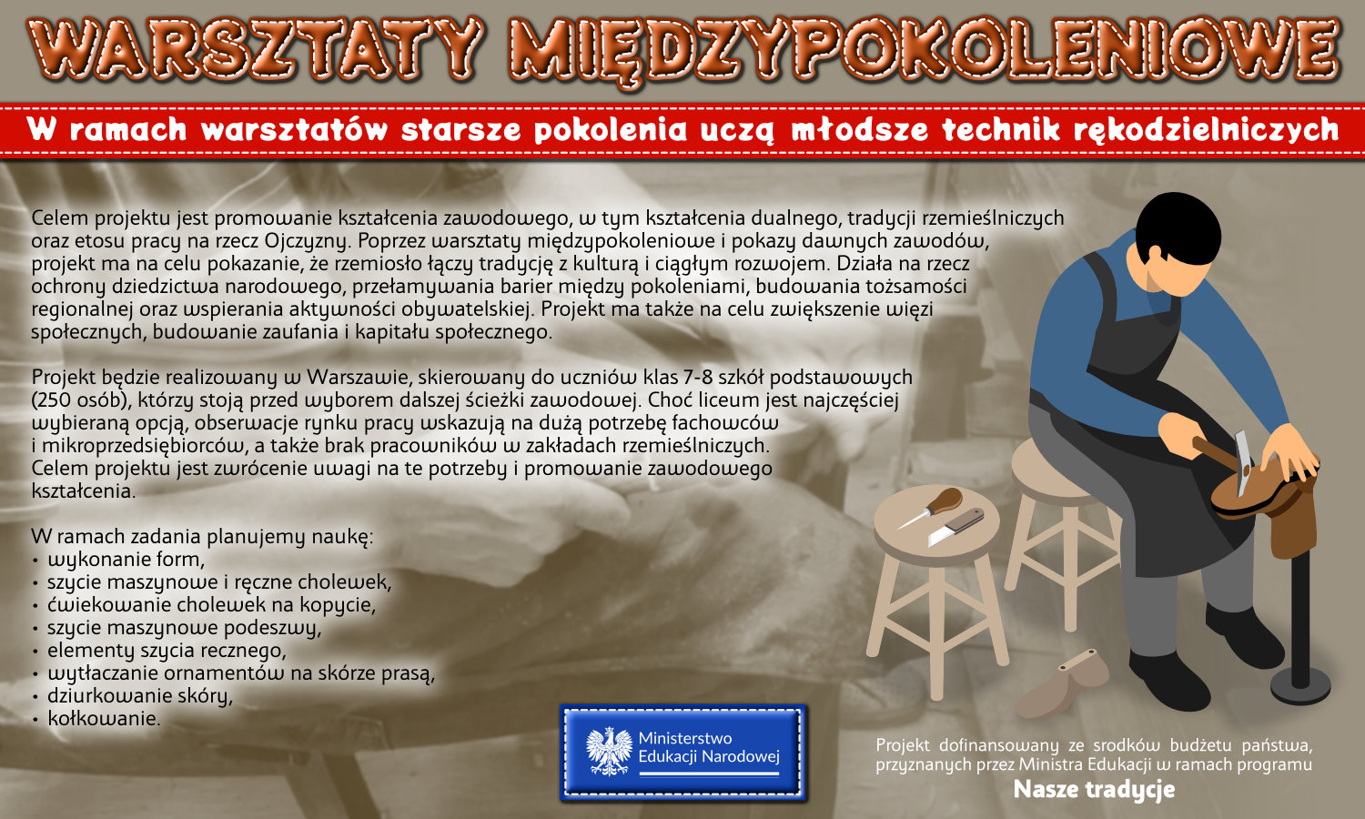 Warsztaty zorganizowane w Cechu Rzemiosł Skórzanych i sfinansowane ze środków Ministerstwa Edukacji Narodowej.